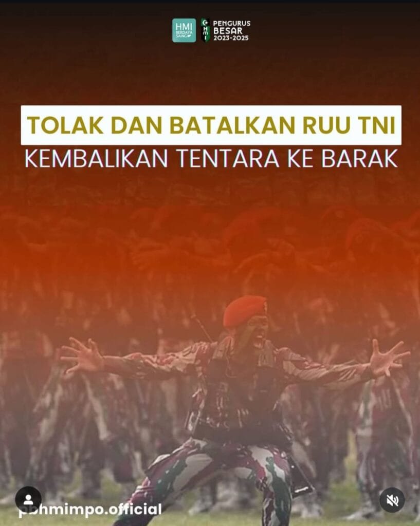 “Cita-cita reformasi adalah membangun sistem demokrasi yang sehat, di mana kekuasaan sipil mengendalikan militer. RUU TNI ini justru menunjukkan tanda-tanda pengembalian pengaruh militer yang sangat bertentangan dengan prinsip-prinsip reformasi,” ujar Ketua Umum PB HMI MPO, Mahfut Khanafi.